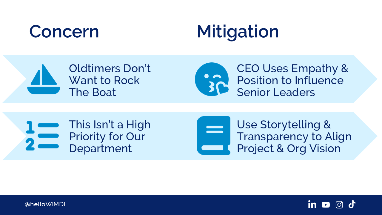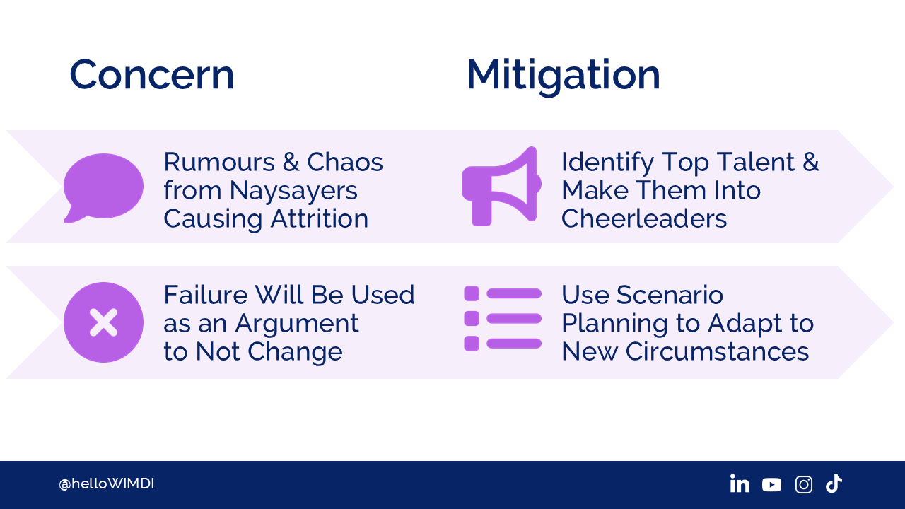 In order to mitigate that, first, identify early on your top talents at every level so they’re not lost. Amina has done that, and these will be her cheerleaders for the project.