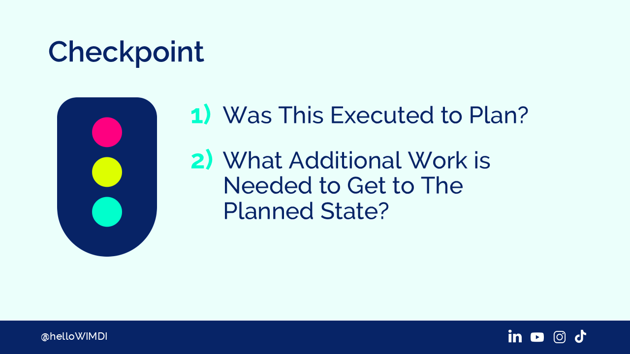 The last checkpoint that Amina and the team will need to know, has execution been carried out the way it was planned? What, if any, additional work or adjustments needed to be put in place, so they could get to the original desired plan.