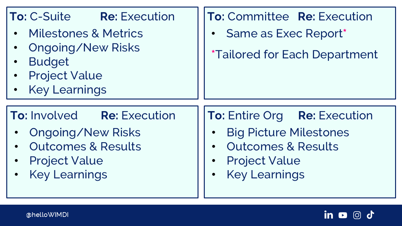 In the communication parts of this phase, Amina will have to consider four groups. First of all, the C-suite needs to receive regular reporting on the progress of the execution.