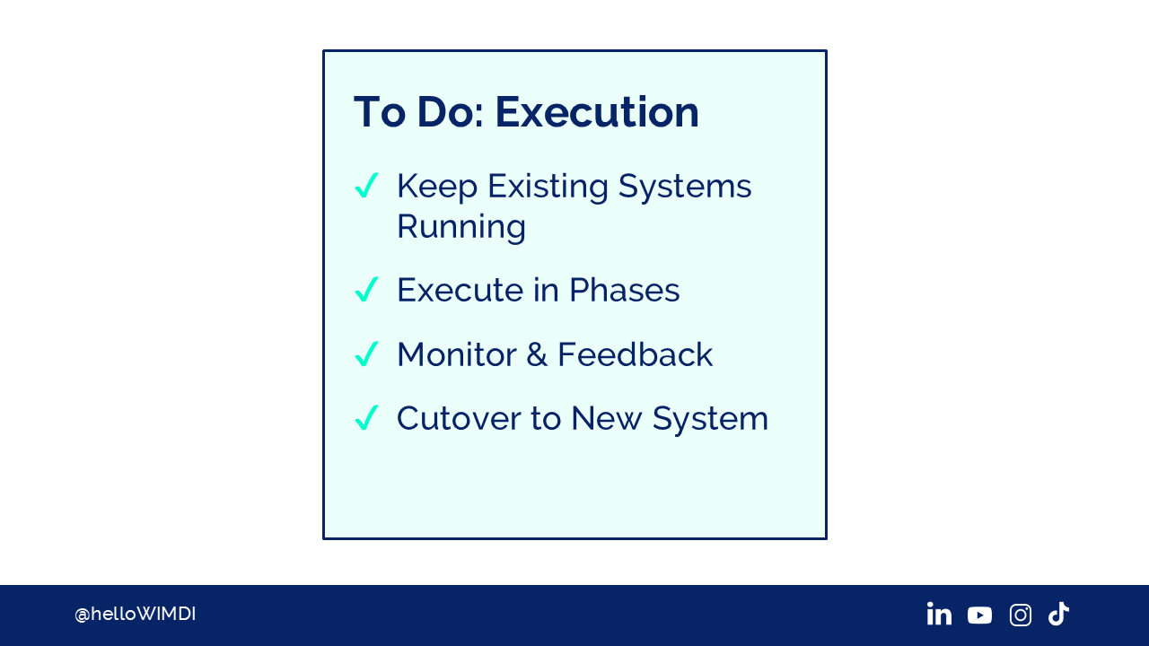 Lastly, the cutover to the new system and processes will need to be done at the right time when everyone involved is ready for it.