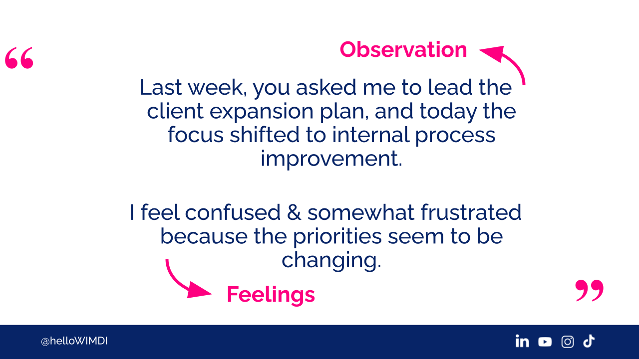 It's your feelings. You're just being really direct, assertive. I feel confused, and I'm somewhat frustrated because the priorities seem to be changing.
