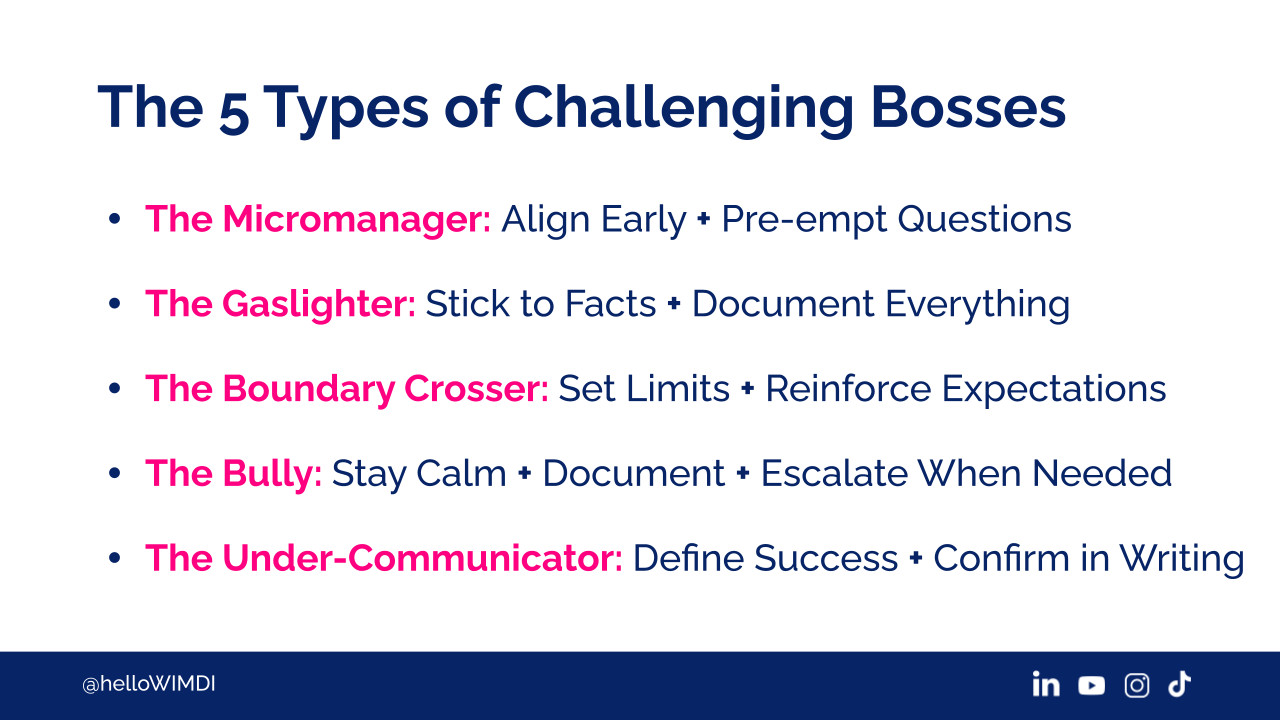 We're going to go into summary. The five types of challenging bosses we talked about tonight was the micromanager. So, you want to align early, and you want to pre-empt with questions. You want to find out what it is that they care about.