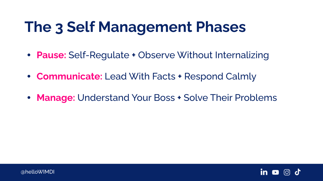 Three self-management phases. Pause, self-regulate, observe without internalising their energy. It has nothing to do with you. It's their emotional dysregulation.