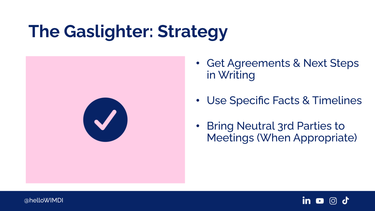 You want to deal in specific facts and get alignment with a gaslighter so that later, they can't suggest that you're the one who's misremembering.