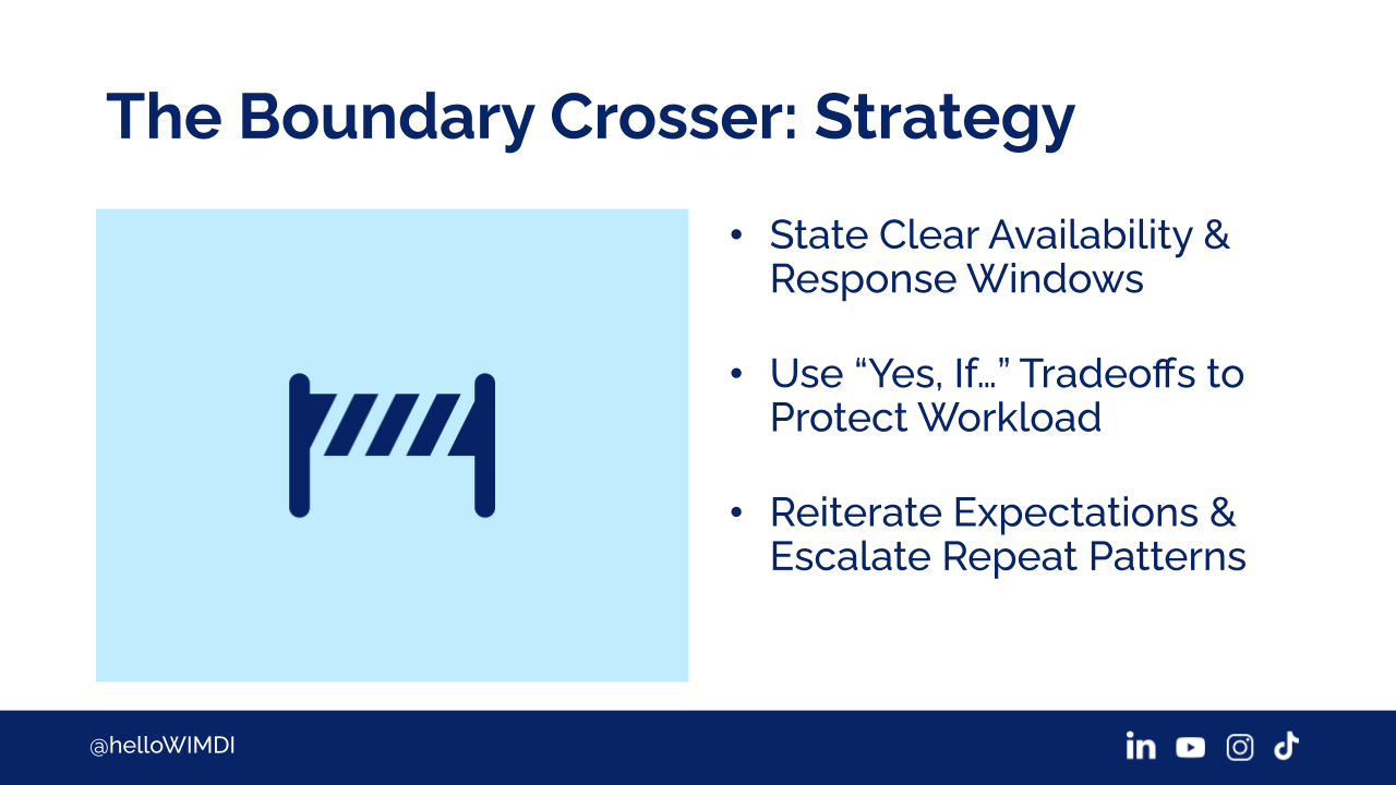 What you want to do is constantly reiterate that you do have boundaries. If you don't do this, your respect is going to feel compromised, right? So, state clear availability and response windows, okay? This is your strategy.