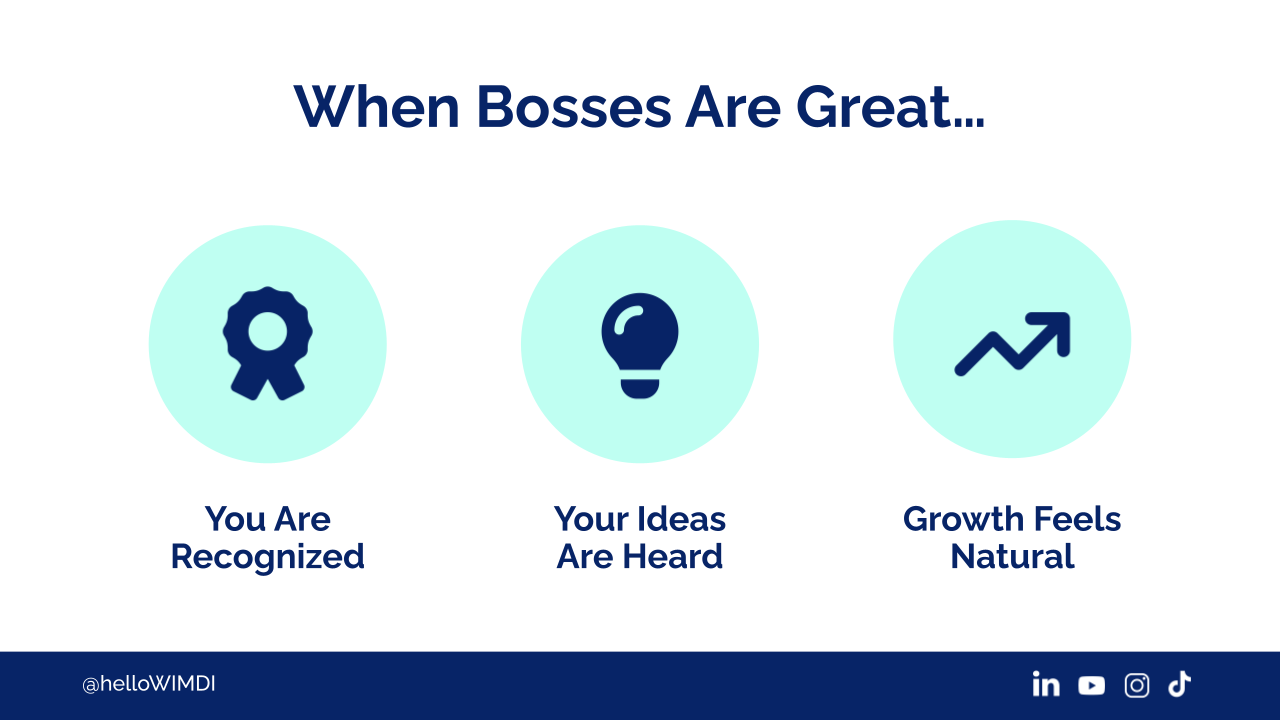 When bosses are great, you are recognised. You feel as if you have a seat at the table. They ask you your thoughts on something, your ideas are heard, and growth feels very, very natural. You feel as if your career is being taken care of.